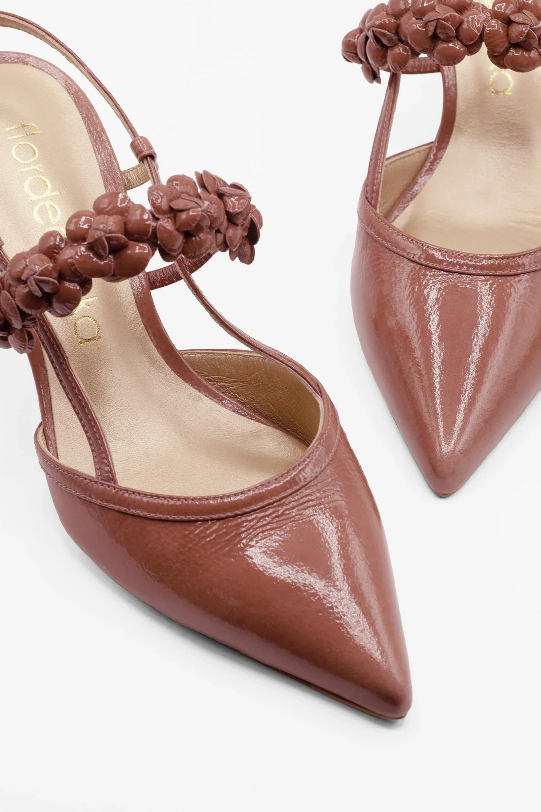 Zapatos cerrados en piel acharolada con terminación en punta. Su diseño único presenta una delicada tira de flores que cruza el empeine. Diseñados con un tacón trapecio extra cómodo de 7 cm, el equilibrio perfecto entre confort y estilo.