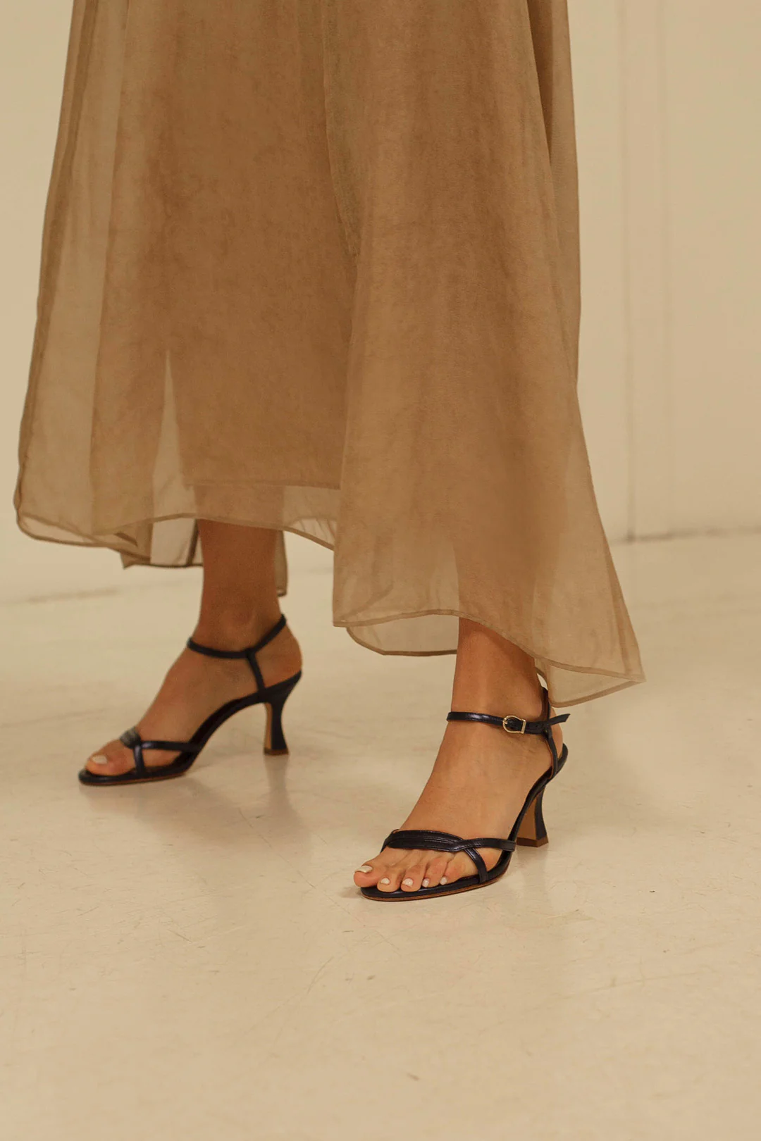 Sandalias con dos tiras cruzadas en color azul cobalto. Este modelo destaca por su silueta clásica con un giro moderno, acompañado de un tacón medio que aporta altura con total comodidad. Es una opción ideal tanto para invitadas que apuestan por el color, como para novias que quieren romper con lo tradicional sin renunciar a la elegancia.