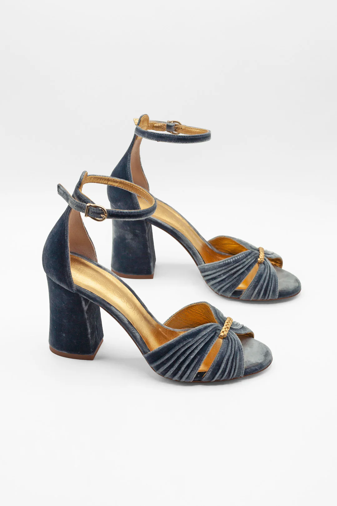Sandalias de terciopelo azules para mujer diseñadas para novia e invitada, fabricados artesanalmente 100% en España.