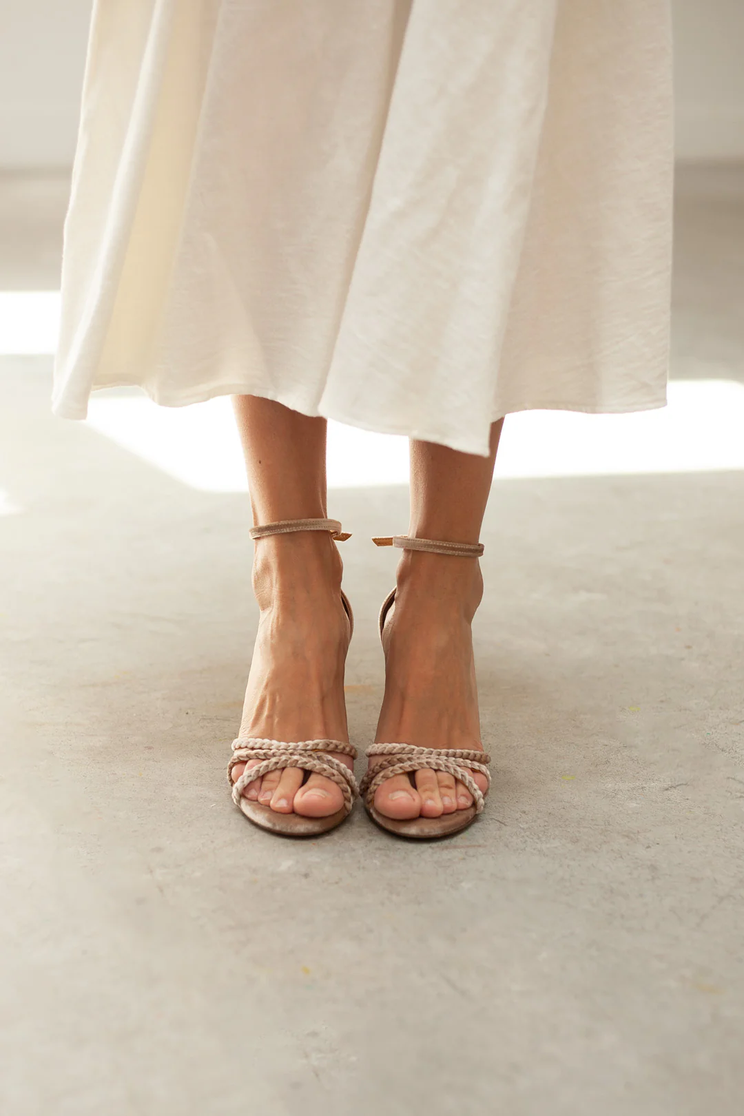 Sandalia de tiras beige trenzadas diseñadas para novia e invitada, fabricadas artesanalmente 100% en España. Su color avellana las hacen muy versátiles para cualquier evento.