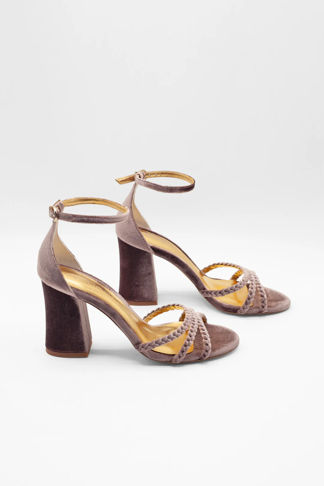 Sandalias de tiras trenzadas en terciopelo color morado, diseñadas para novia e invitada. El tono pruno del terciopelo es elegante y profundo, aportando personalidad y estilo a cualquier look.