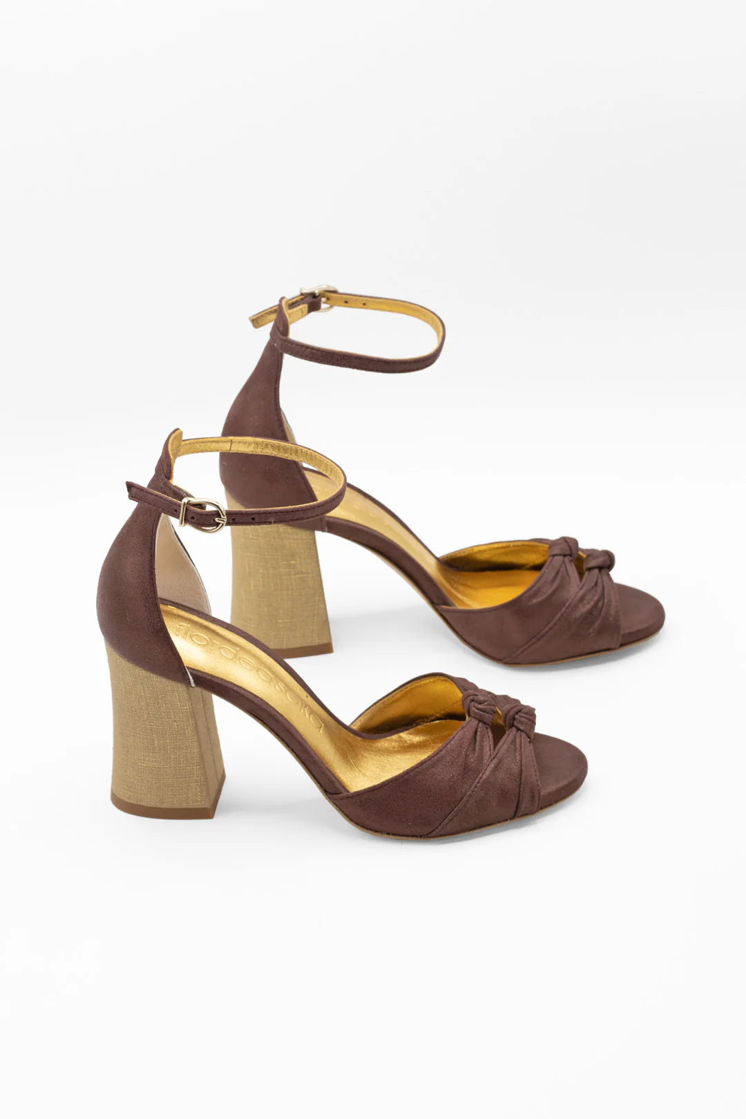 Sandalias con nudos en ante metalizado color cereza, y tacón en lino dorado de 9 cm. Ideales para las que buscan dar ese "toque" de color.