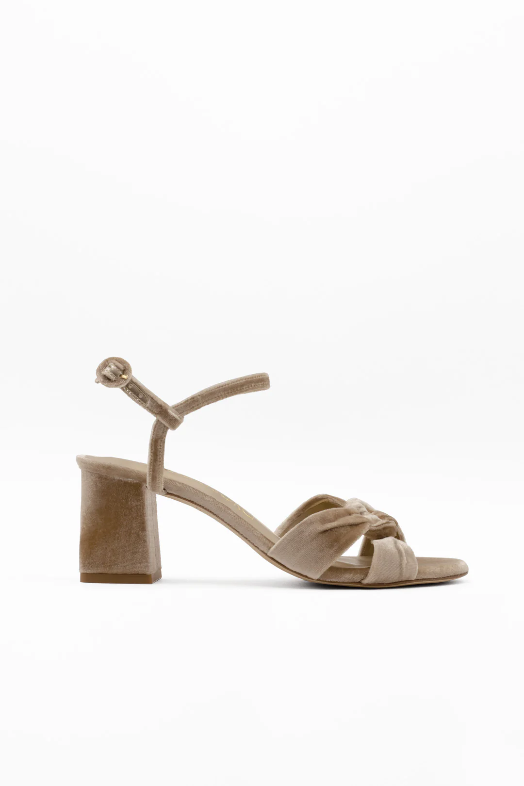 Sandalia en terciopelo color avellana, un tono cálido y neutro, ideal para novias e invitadas que buscan un tono suave y versátil.