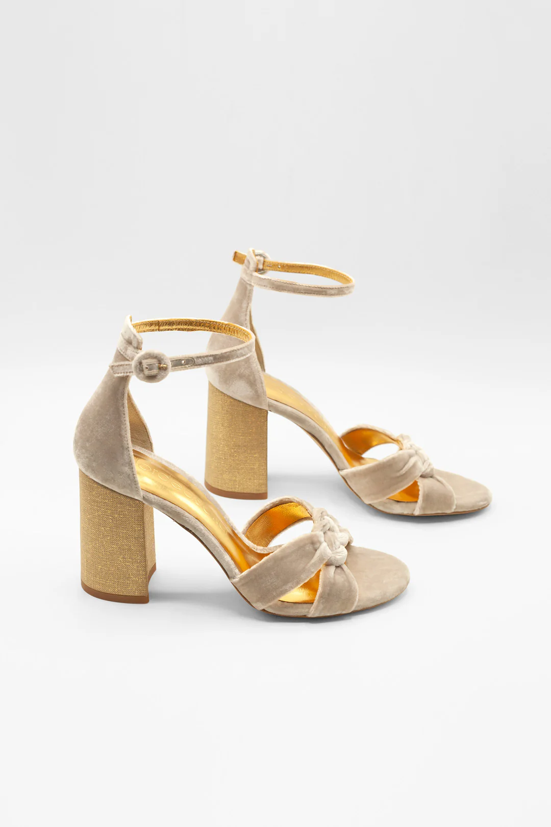 Sandalias de terciopelo con nudo en color blanco roto un tono suave y luminoso que combina con todo. Su tacón en lino dorado le aportan un toque de personalidad perfecto.
