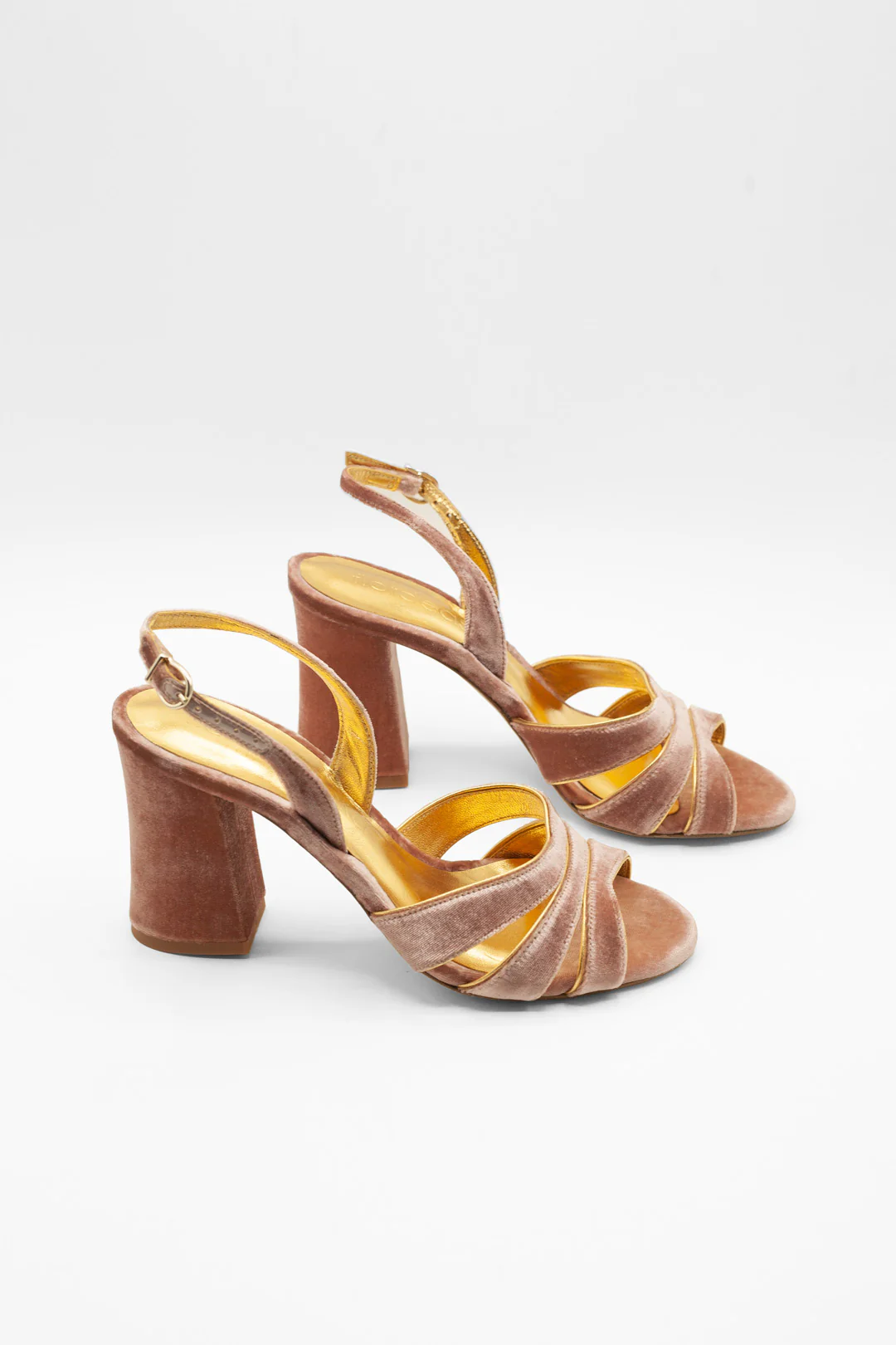 Sandalia romántica en terciopelo rosa con detalles dorados en las tiras, diseñada para novias e invitadas. Fabricada artesanalmente 100% en España. Tacón cómodo y estable, ideal para lucir elegante durante todo el día.