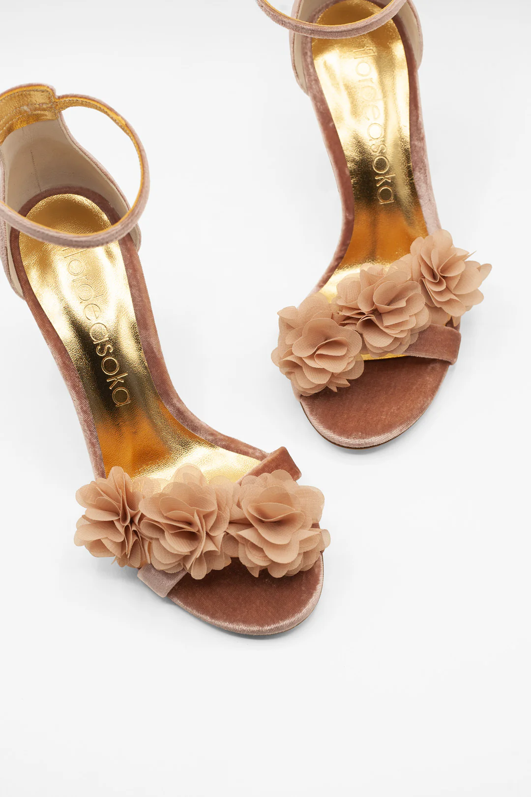 Sandalias de terciopelo color rosa empolvado con delicadas flores de organza, diseñadas para novias e invitadas que buscan un estilo romántico y elegante. Fabricadas artesanalmente 100% en España con materiales de alta calidad.