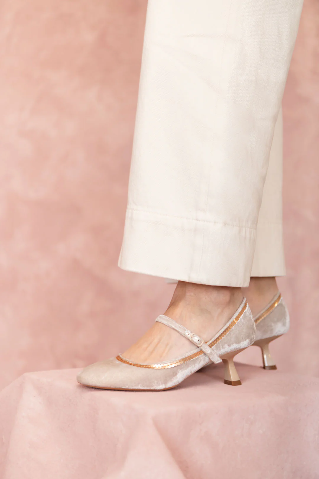 Tacón bajo lacado beige cómodo y estable.