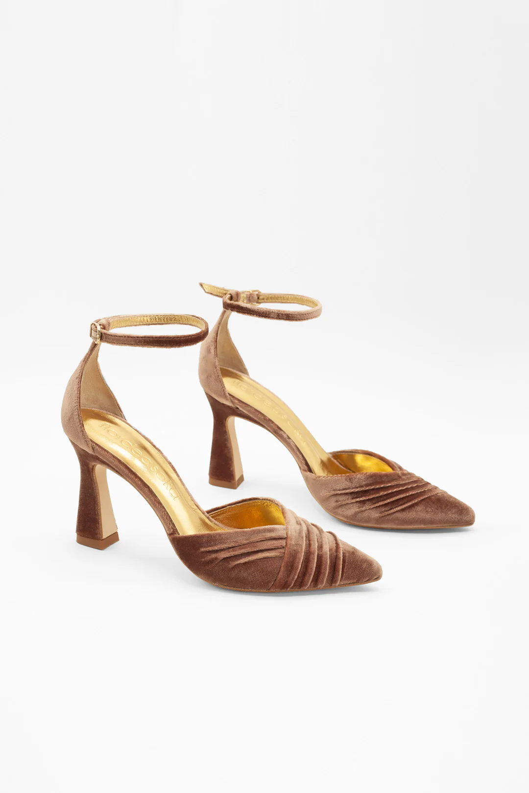 Zapato cerrado en terciopelo color garnet, un burdeos profundo y sofisticado. Con tacón bloque de 9 cm y pulsera al tobillo, combina elegancia, sujeción y comodidad.
