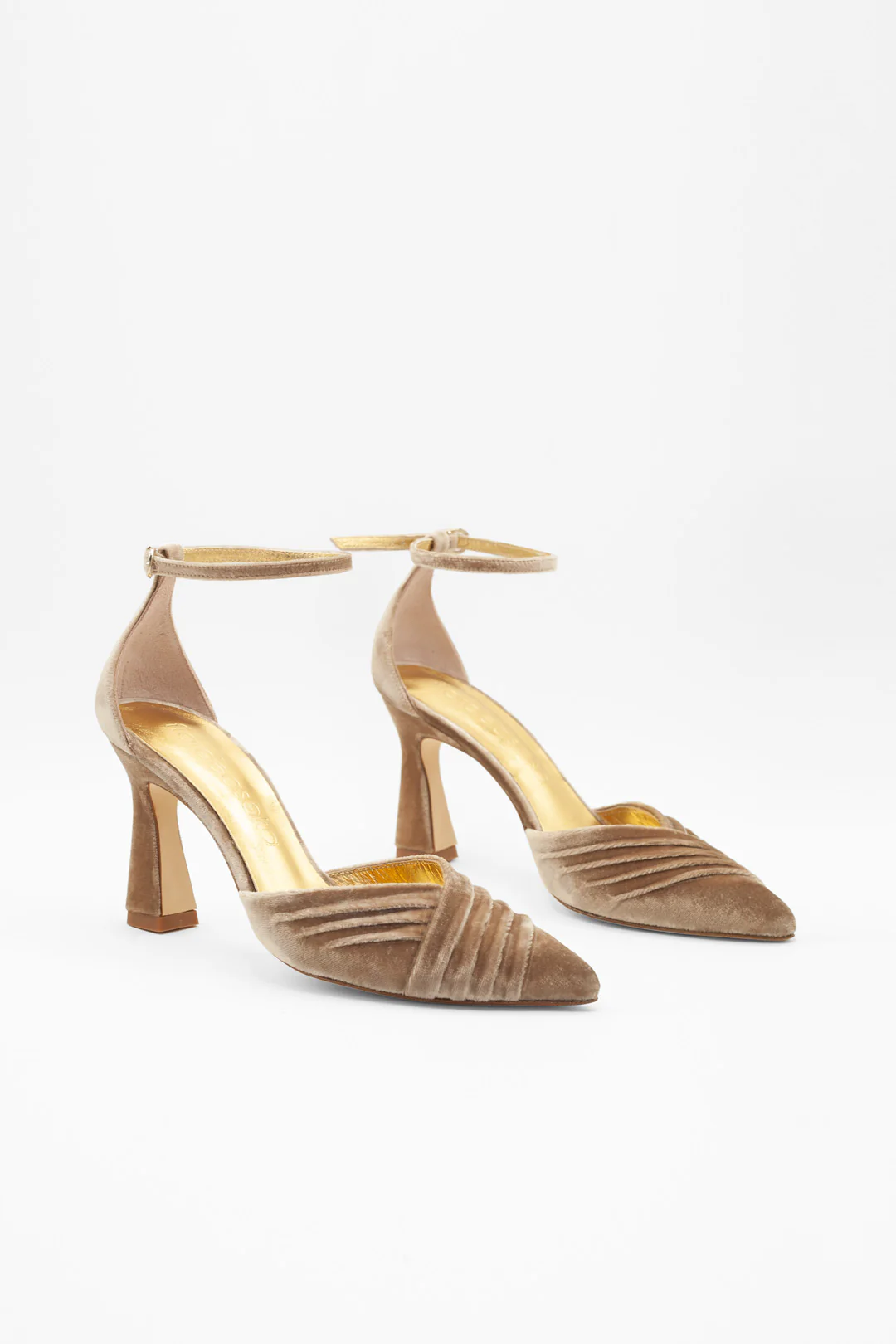 Zapato cerrado en punta en terciopelo color avellana, un tono cálido, neutro y elegante. Su diseño con pulsera al tobillo y tacón trapecio de 9 cm aporta sujeción, altura y comodidad. Una opción versátil y atemporal para invitadas que valoran la sencillez con estilo.