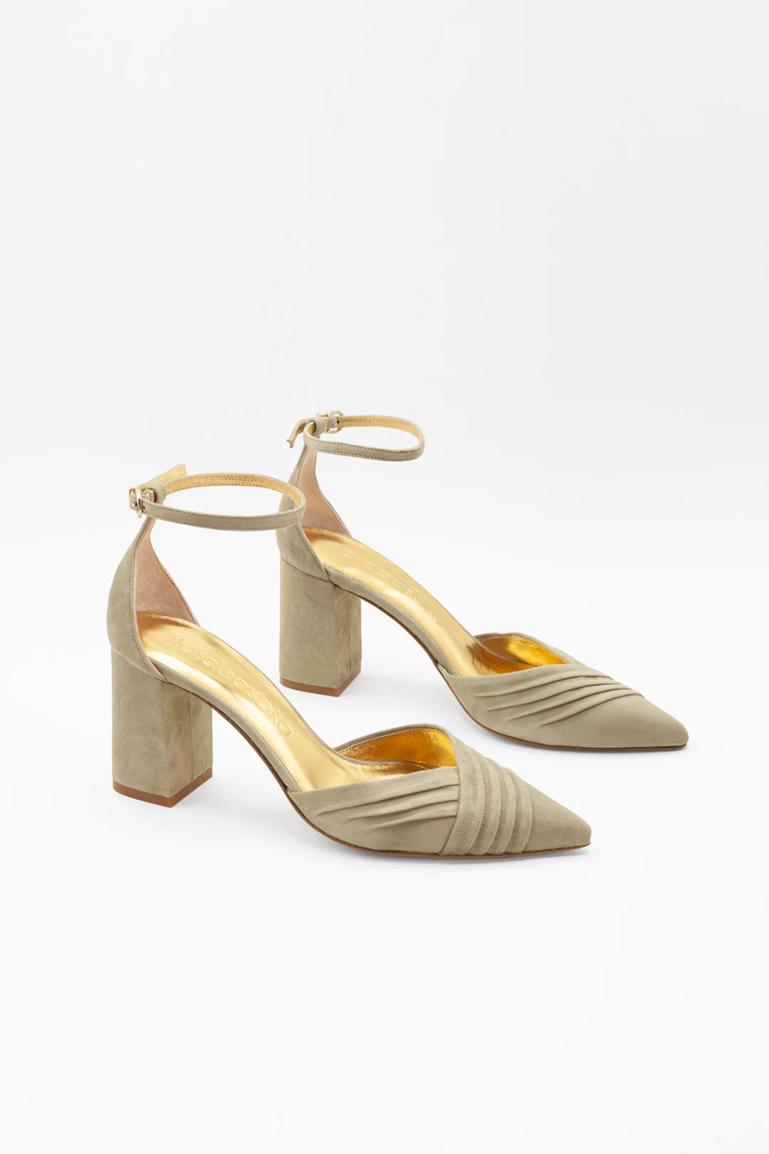 Zapato cerrado en punta en ante en color nilo, un verde sereno y sofisticado que aporta frescura y elegancia.