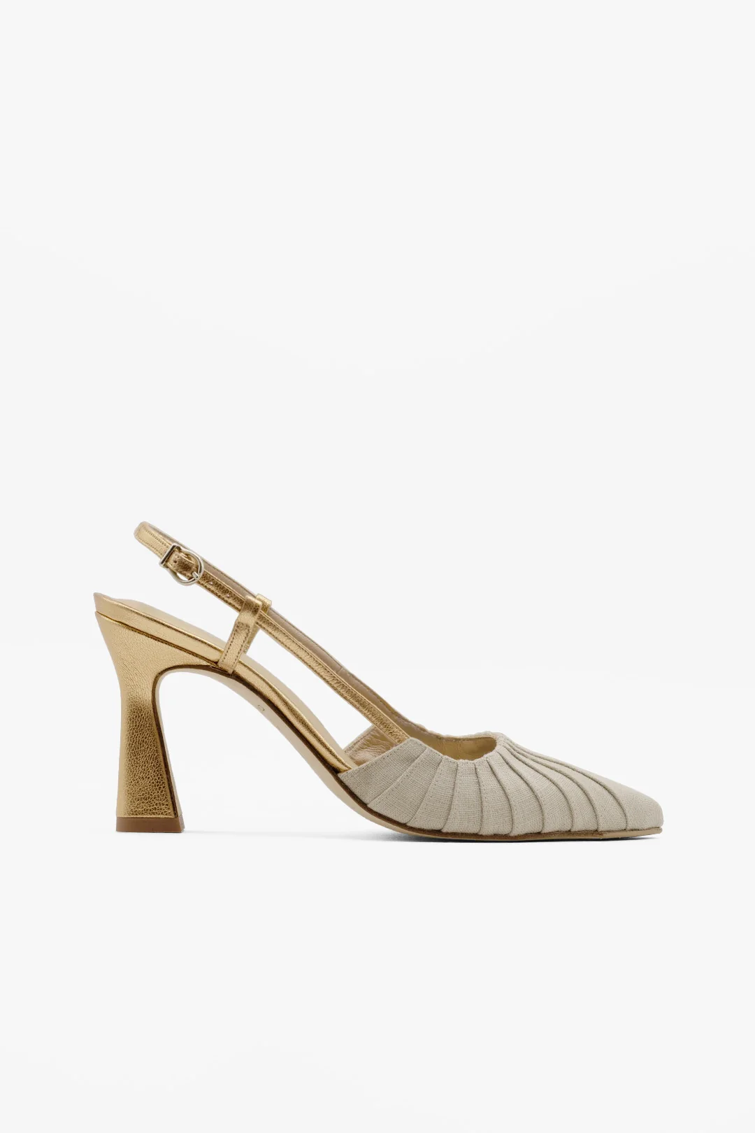 Zapato cerrado de punta en lino con pliegues. Se distingue por su textura orgánica y su diseño elegante. Es una opción perfecta tanto para novias de estilo natural o rústico-chic, como para invitadas que buscan un toque sofisticado.